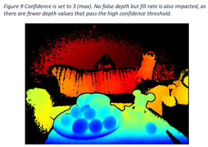 - 신뢰 임계값 : 0-3 사이 조정 가능. 깊이 맵은 깊이 점당 신뢰 값으로 필터링 됨. 이 슬라이더가 0으로 설정되면 필터링이 수행되지 않으므로 노이즈가 너무 높고 측정이 잘못되었을 때에도 계산된 모든 깊이 값을 표시함. 이 값을 최대로 설정하면 매우 높은 신뢰도 측정만 통과함. 기본 설정은 1임. "싱글샷" 성능에 의존하고 여러 프레임의 시간 평균을 통해 잘못된 깊이 값을 처리할 여유가 없는 애플리케이션에는 높은 신뢰 임계값이 권장됨. 반면에, 시간 필터링과 추적을 허용할 수 있는 응용 프로그램은 데이터 채우기 속도를 높임에 따라 Confidence가 낮게 작동할 수 있다.