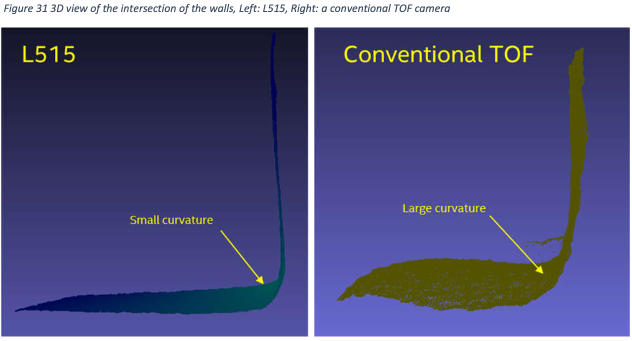 - 아래 예시에서, L515와 기존의 TOF 카메라는 두 벽의 교차점을 가리킴. L515는 벽 교차로에 소량의 곡률을 가진 직선 벽을 보여주는 반면, 다른 카메라는 교차로에서 구부러진 벽과 훨씬 더 큰 곡률을 보여줌